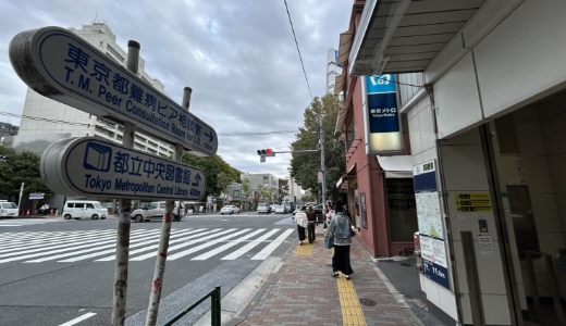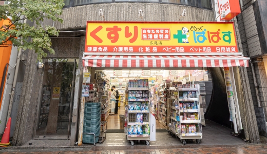 広尾商店街に入りまっすぐ進みます。左側にドラッグストアぱぱすの看板が見えてきます。